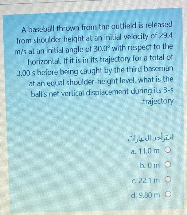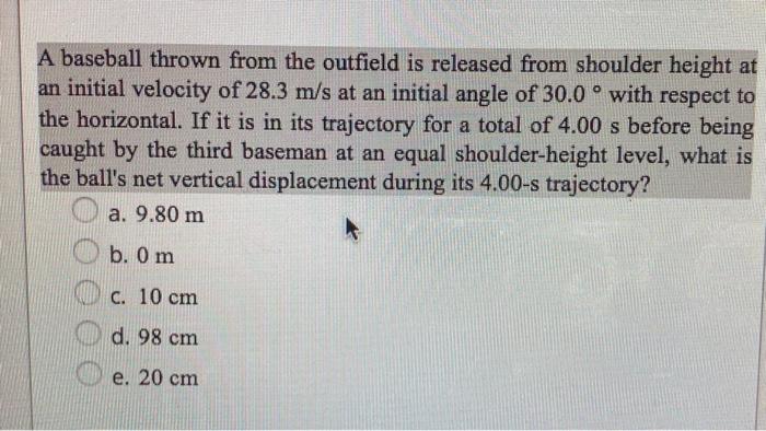 Solved A Baseball Thrown From The Outfield Is Released From Shoulder Height At An Intial Velocity Of 29 4 M S And An Initial Angle Of 30 0 Degrees With Respect To The Horizontal The Ball